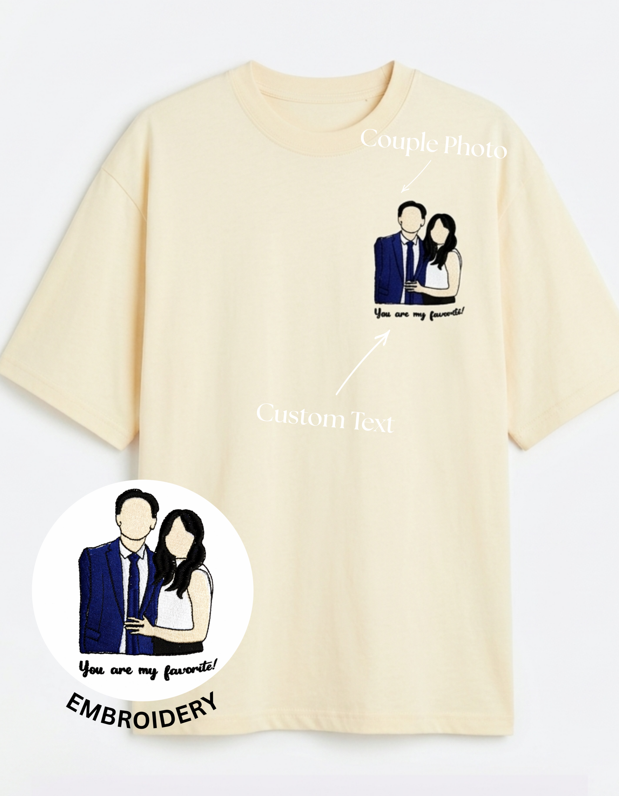 Bring your ideas, memories, or special moments to life with our custom embroidery t-shirts. Whether it’s a meaningful photo, your pet, a couple design, or a personal message,We transform your photo into a clean, detailed embroidery you can wear every day — and a meaningful gift they’ll cherish forever.